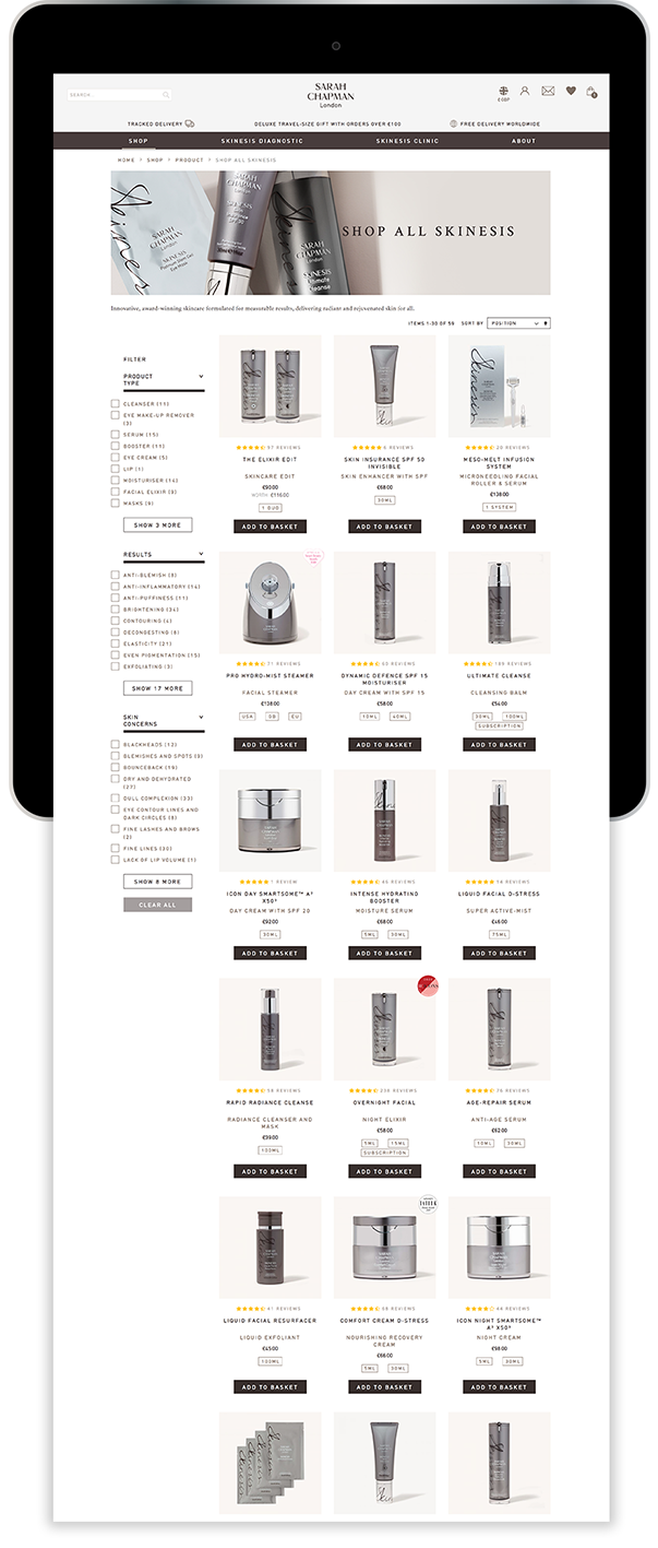 We rebuilt the Sarah Chapman eCommerce store on the Magento 2 platform, with a refreshing brand new design which was more engaging and user friendly than the old dated and clunky version. We implemented helpful and valuable features, such as advanced rich filters, and integrated with Klevu’s smart search, making browsing and finding products a breeze for customers.